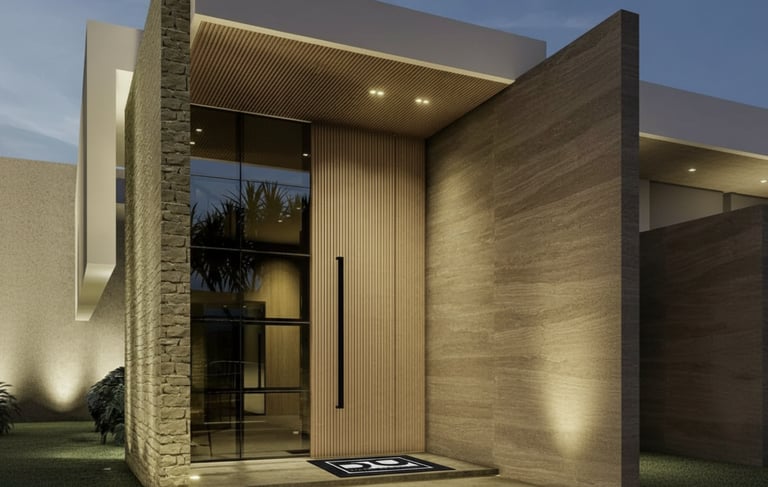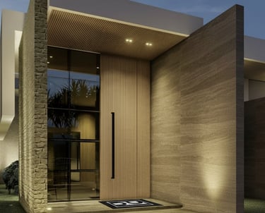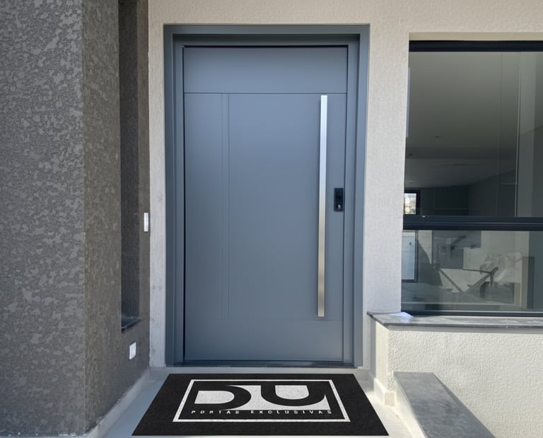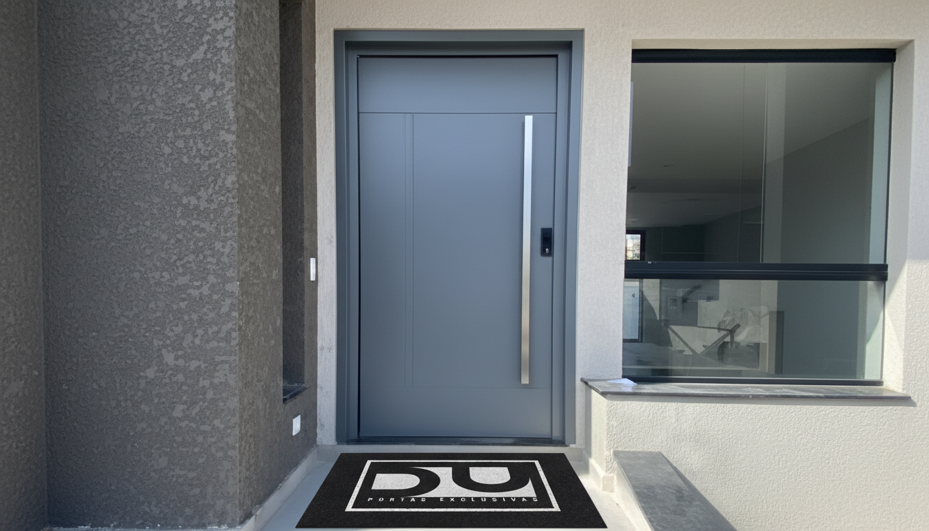 Porta em ACM com acabamento liso e estrutura reforçada em perfis metálicos, projetada para alto desempenho e durabilidade. Sistema de abertura pivotante com eixo deslocado, puxador linear em alumínio e possibilidade de integração com fechadura digital. Design clean, alta resistência e excelente estabilidade dimensional.